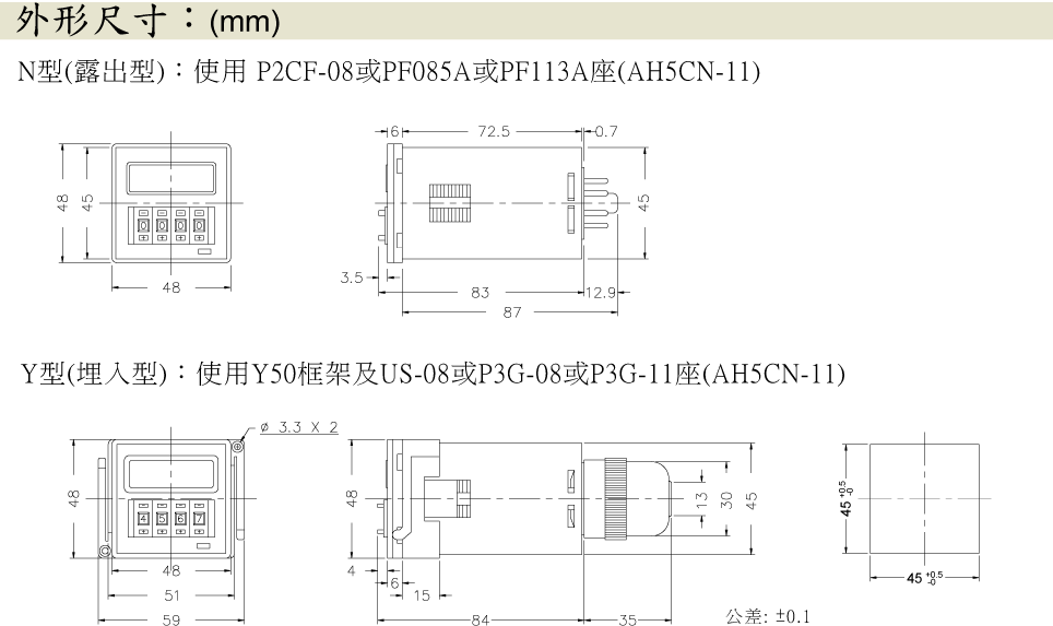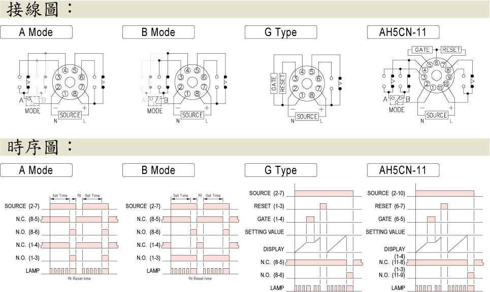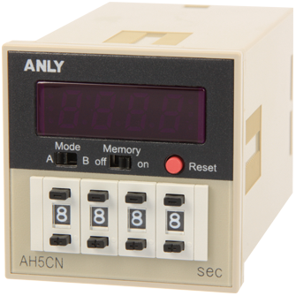 上一個 下一個 限時繼電器 數位式限時繼電器 AH5CN 數字型限時繼電器 加入詢問單 開啟詢問單 產品說明 接線與時序圖 外型尺寸或其他 檔案下載 使用LED數字顯示,時間明確,易於監視。 具有防電源端突波干擾,及耐高頻干擾之特性。 時間範圍從99.99秒至99990小時(十進位制)及99分59秒,99小時59分(六十進位制)多種規格可供選擇。 具有開關可設定斷電記憶,其記憶為永久性。 可手動設定RESET開關。 具有A/B Mode切換開關,可以自由選擇A Mode(2C,即兩組限時接點)或B Mode(1A1C,即一組瞬時接點和一組限時接點)的操作模式。 其動作方式可指定上數(加數)或下數(減數)。 可當作『累時計』(Hour Meter)使用。 G Type具外部暫停接點之功能。 具有UL, C-UL 及 CE 認證。 AH5CN 產品型錄 AH4CN-R/AH5CN 使用手冊