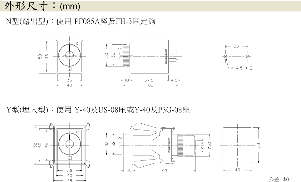 上一個 下一個 限時繼電器 類比式限時繼電器 AH3 多段限時繼電器 加入詢問單 開啟詢問單 產品說明 接線與時序圖 外型尺寸或其他 檔案下載 使用專用CMOS IC,具省電、穩定及準確之特性。 使用Y-40之專用框架,即可將露出型轉變為埋入型。 具有五種(NA,NB,NC,ND,NE)不同時間系列可供選擇。* 每一種時間系列皆可藉由指撥開關切換四種不同的時間範圍。* 具有A/B Mode切換開關,可以自由選擇A Mode(兩組限時接點)或B Mode(一組瞬時一組限時接點)的操作模式。* 具有CE認證。 註:有*號者表示只適用於AH3多段可調型系列。 AH3 產品型錄