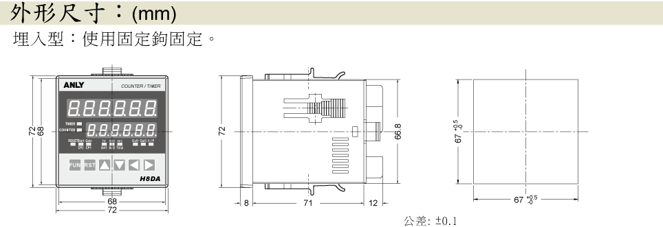 上一個 下一個 限時繼電器 數位式限時繼電器 H8DA 多功能數位式計數器/計時器 加入詢問單 開啟詢問單 產品說明 接線與時序圖 外型尺寸或其他 檔案下載 具有計數器及計時器的功能(兩者擇一使用)。 各個功能參數可於面板上的循環式選單 中設定。 可外接使用近接開關或光電開關輸入。 具有高速響應特性,計數速度可達每秒10,000次。 允許計數(計時)中改變設定值。 具有4個階層的按鍵鎖定功能。 可選擇其動作方式為上數(加數),下數(減數)或上下數(加減數)。 具有斷電記憶,其記憶為永久性。 具有CE認證。 H8DA 產品型錄 H8DA 使用手冊