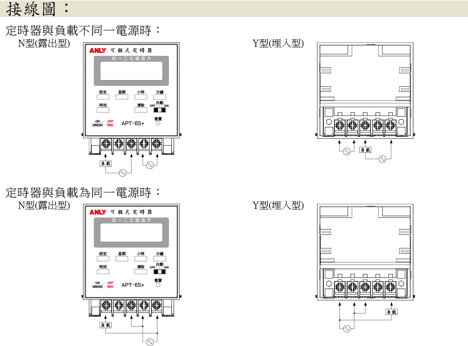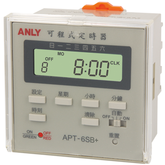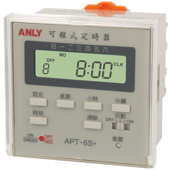 下一個 限時繼電器 可程式定時器 APT-6S+/APT-6SB+ 可程式定時器 加入詢問單 開啟詢問單 產品說明 接線與時序圖 外型尺寸或其他 檔案下載 一週七天可程式循環控制,可設定一週內不同時段設定及預約定時。 亦可作為24小時計時器。 可設定48組時間定時。 具有15種不同星期變化組合可供選擇。(請參閱下列附表) 內含鋰電池,可提供停電記憶一年。 使用石英振盪器,故其精確度高。 具有LCD背光顯示功能。* 具有UL, C-UL 及 CE 認證。 註:有*號者表示只適用於APT-6SB+。 APT-6S+/APT6SB+ 產品型錄 APT-6S+/APT-6SB+ 使用手冊 APT 系列配線參考示意圖